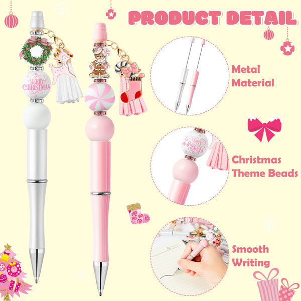Value Set: You will receive 12pcs pink/white beaded pens, 67pcs of round beads and Christmas element wooden beads, 100pcs of pink/white rhinestone crystal spacer beads, 24pcs pink/white alloy buckles with tassel, 12pcs stocking and deer alloy ornaments and 12pcs laser foil bags. These accessories can make up to 12 pens.