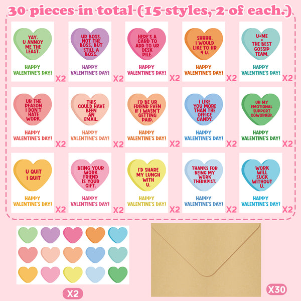 Value Set: You will receive 30 envelopes, 30 funny element cards (15 styles, 2 of each) and 30 seal stickers (15 styles, 2 sheet of each). It has enough cards for you to express your true feelings, and there is funny information on the card cover.