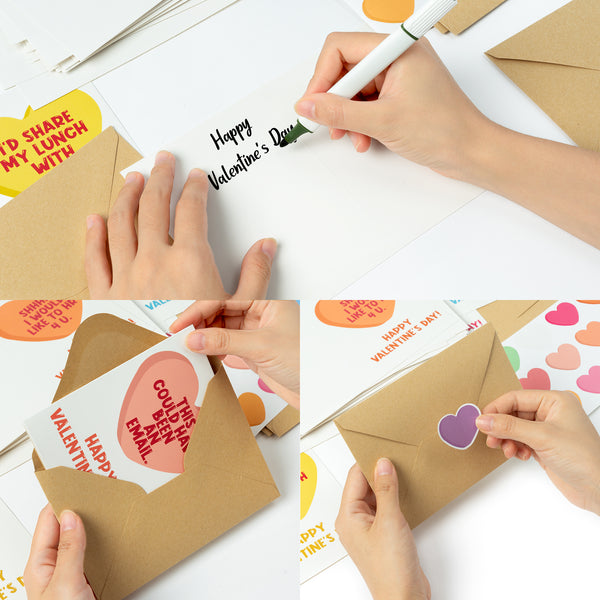Material: This set of cards are made of thickened paper, which is not easy to deform and damage, and can be stored for a long time. The thickened paper will not leak the color of the ink when writing on the inside page, which is a good fun card set for Valentine's Day.